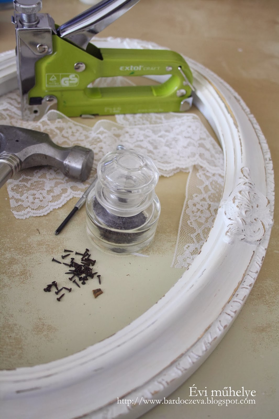 Én az akasztóját is csipkére cseréltem, csak hogy ha már lúd, legyen kövér, de ez nem alap feltétel. Arra gondoltam, én naiv, hogy kipróbálom a kis kárpitos szegeket és azzal rögzítem a csipkét...hát rossz ötlet volt. Maradjatok a tűzőgépnél. Tízszer biztosan gyorsabb és sokkal tartósabb, erősebb eredményt is kaptok.