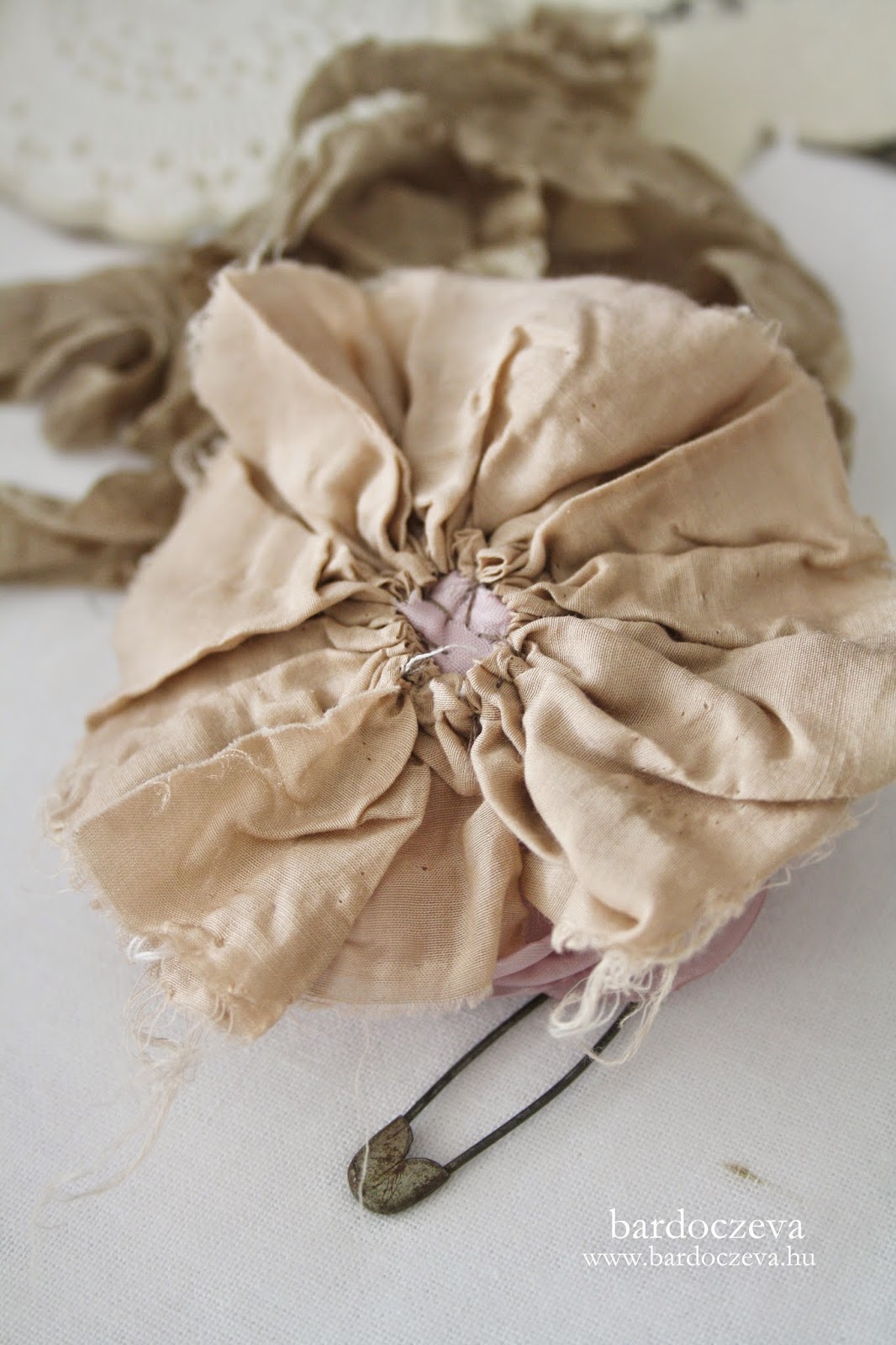 Kell egy kb 6 cm széles csík, tépni kell...nem vágni. Utána kicsit meg kell tépkedni, csiszolóval vagy bármilyen reszelővel. Félbe hajtani és felráncolni a hajtásnál. Így dupla lesz.Szebb, tömöttebb.