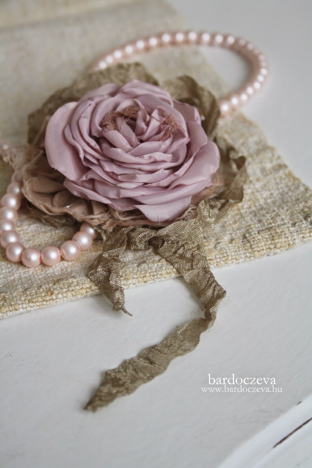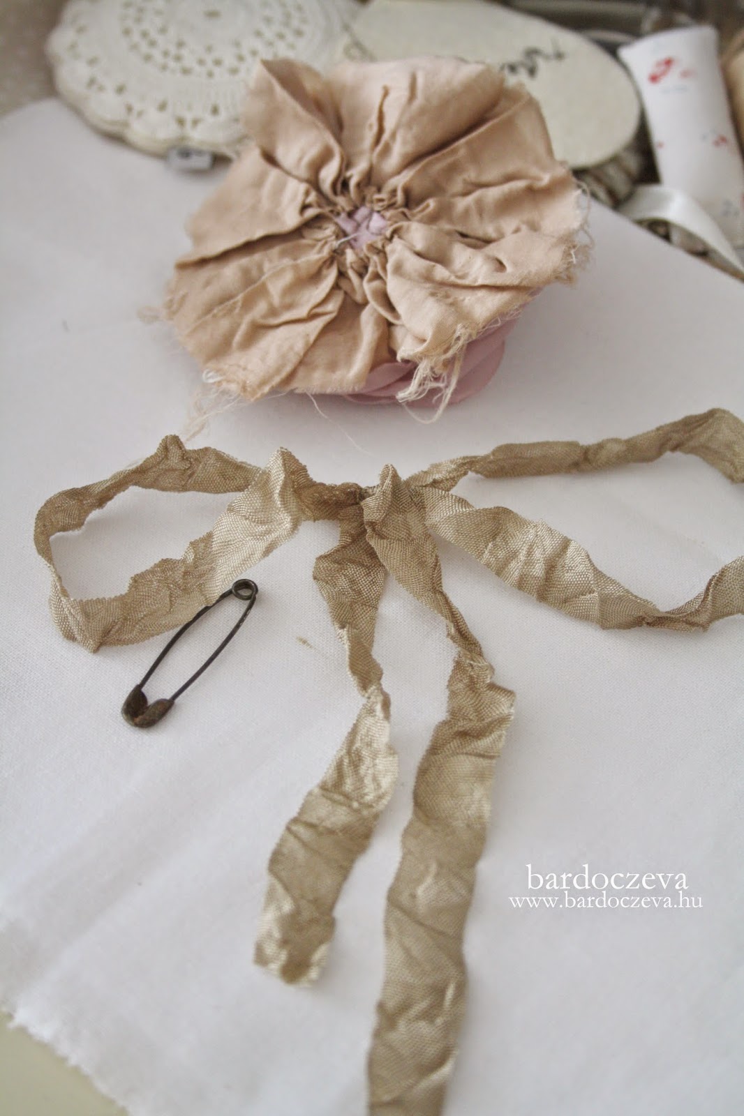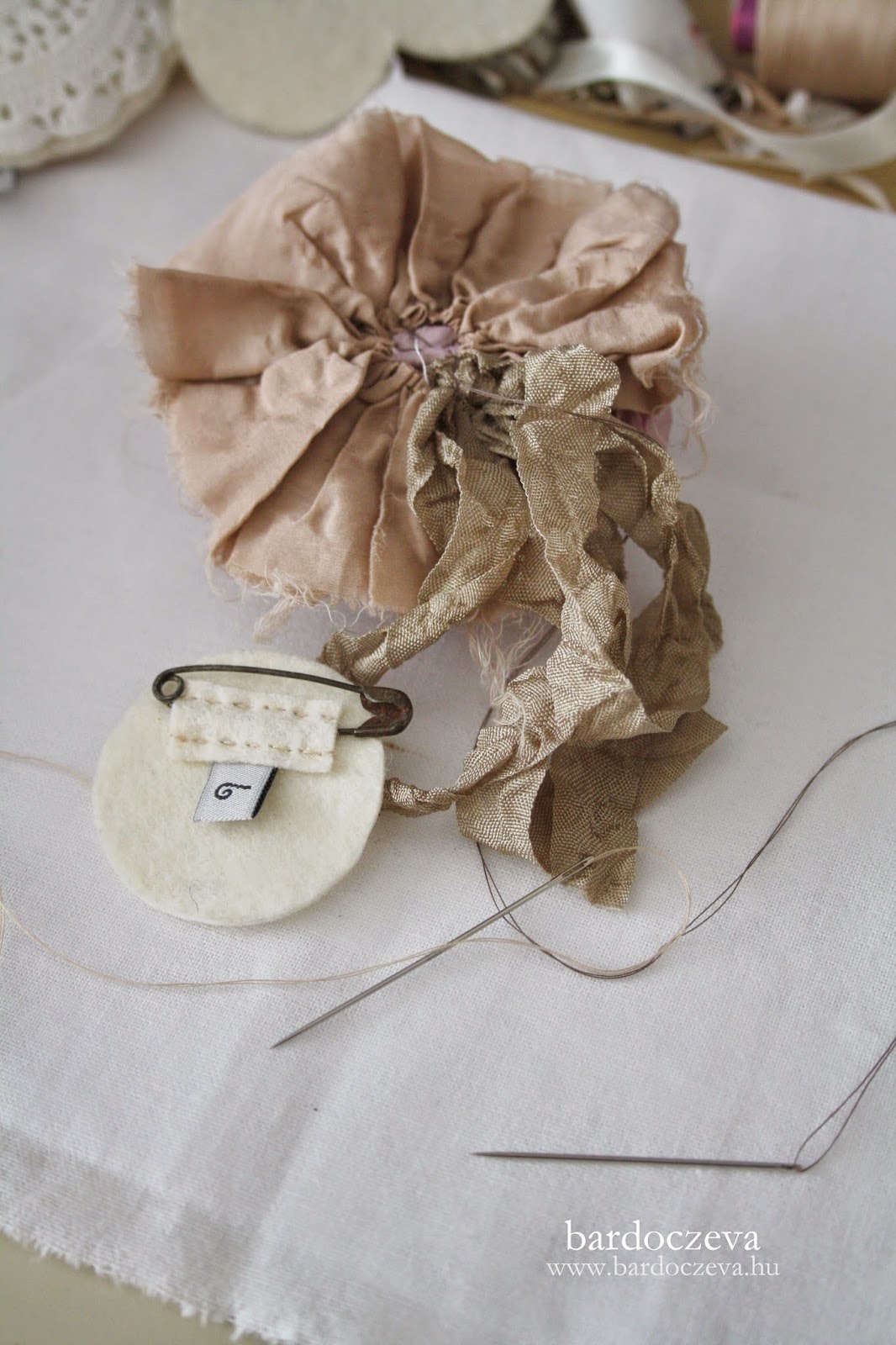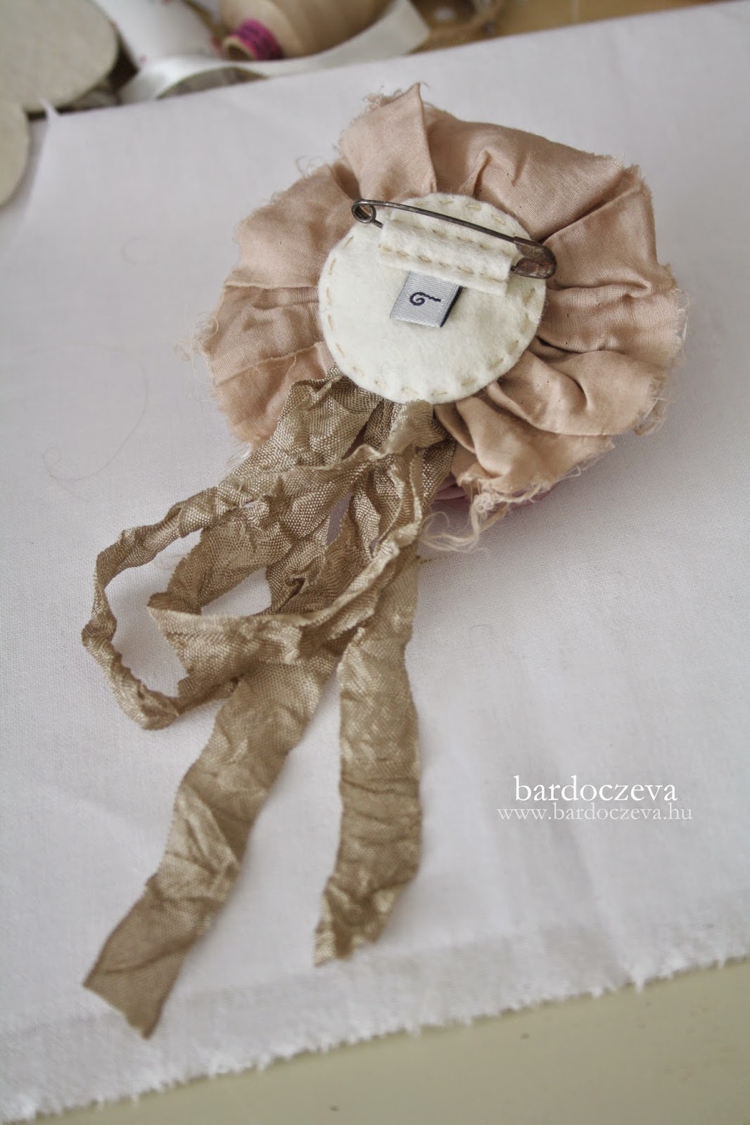Simán masnira kötöm a gyűrt szalagot, jó nagy fülű masnira és oda öltöm azt is, ahol a ráncolt anyag a legvékonyabb, ahol hiányzik egy kis "anyag". A kör alakú filcet egész egyszerűen ragasztópisztollyal ragasztom fel. Jó alaposan.