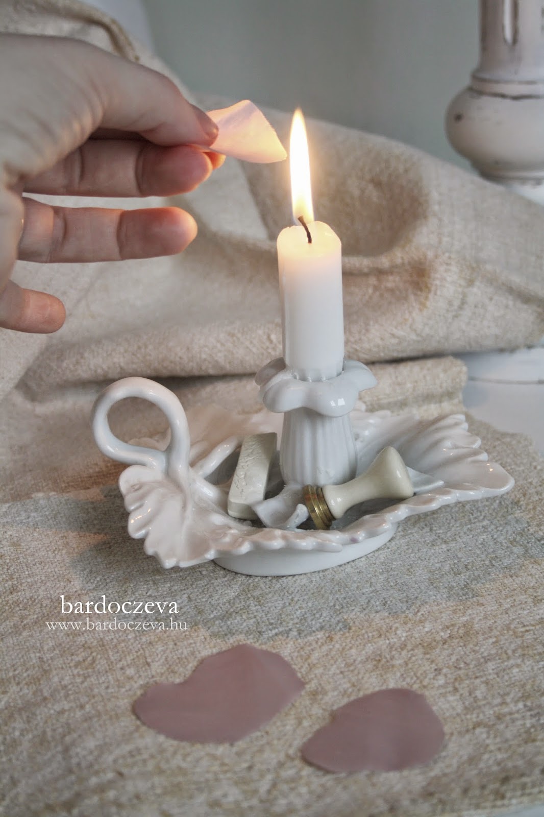 A szirmokat körbevágás után a láng fölé (mellé) tartom és határozott mozdulatokkal forgatom, hogy viszonylag egyformán olvadjon mindenhol. Az olvadással jár, hogy elkezd kunkorodni valamelyik irányba (előre én sem tudom soha, hogy felfelé, vagy lefelé fog), de utána már következetesen arra megy általában.