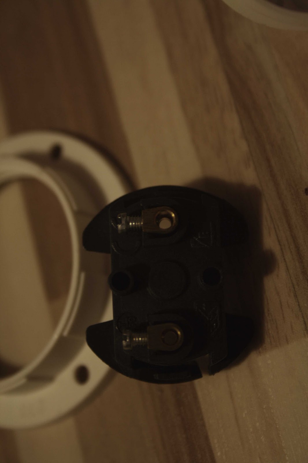 A vezeték végén levő két drótot a kis csavarok segítségével rögzíteni kell a két lyukba, teljesen mindegy, hogy melyiket melyikbe.utána pedig az egész vezetéket alulról vissza kell húzni, amíg lehet, és alul a korábban említett csavarral rögzíteni.